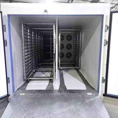2.Direkayasa untuk Dehidrasi Seragam: Menampilkan sistem sirkulasi bervolume tinggi yang ditenagai oleh bank 6 kipas heavy-duty yang menghasilkan 3000-4500 m³/H aliran udara berkelanjutan. Saluran lantai aerodinamis memaksa udara kering secara merata ke semua 180 nampan secara bersamaan, mencegah jamur lokal atau pengeringan yang kurang.